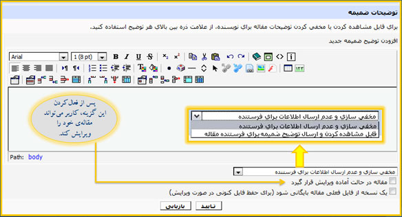 همچنین می‌توانید از امکانات ارسال پست الکترونیک و ارسال پیغام به کاربران (مدیریت برقراری ارتباط) نیز برای خبررسانی به نگارندگان بهره ببرید.